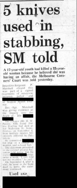 There's also a police interview with the suspect. He was 17 and worked at the same shoe factory. He visited the house in North Fitzroy regularly to talk to Iris about his troubles. They were previously also neighbours. There's a transcript of the killers conversation with his Mum as she visits him at the police station. So much crying. So much disbelief that her young son could kill her ex-neighbour and obviously someone she knew.